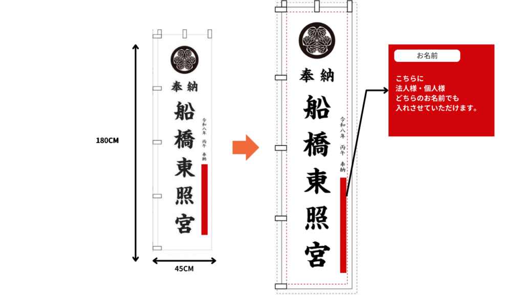 ※幟旗の「奉納者名」は、個人名・会社名・団体名など、好きな名前が記載できます(領収書を発行いたします)。また、どなたでもお申込み可能ですので、お気軽にお問合せください。